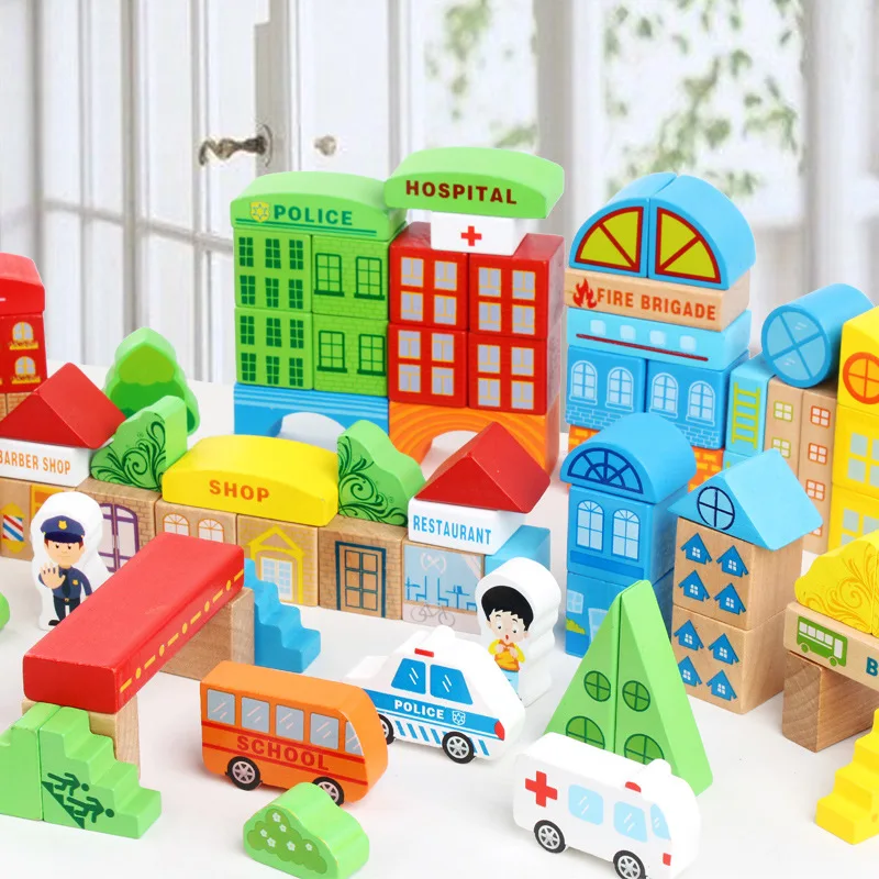 Best Seller 100Pcs Baby Toys City Traffic Scenes Geometric Shape Wooden Juguetes Building Blocks Early Educatio